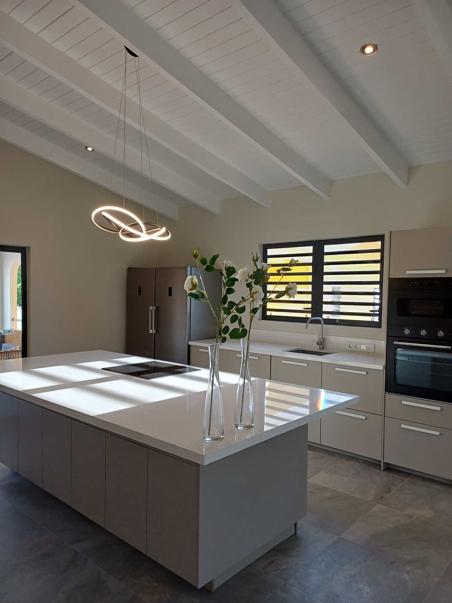Luxe keuken met kookeiland, elektrische kookplaat, vaatwasser en hoogwaardige inbouwapparatuur