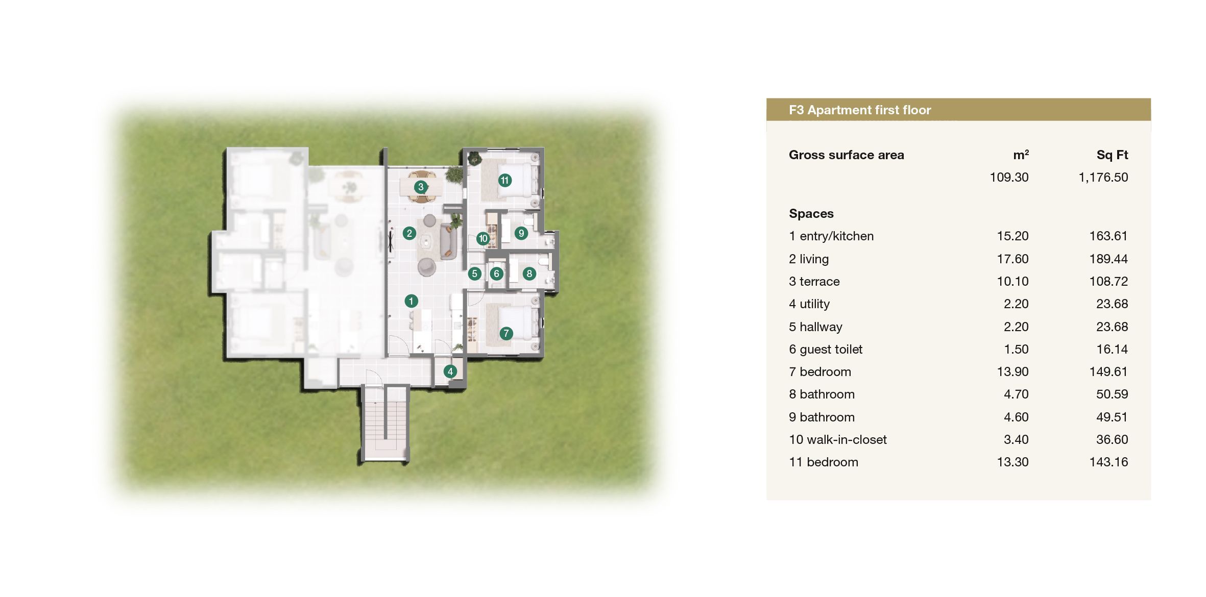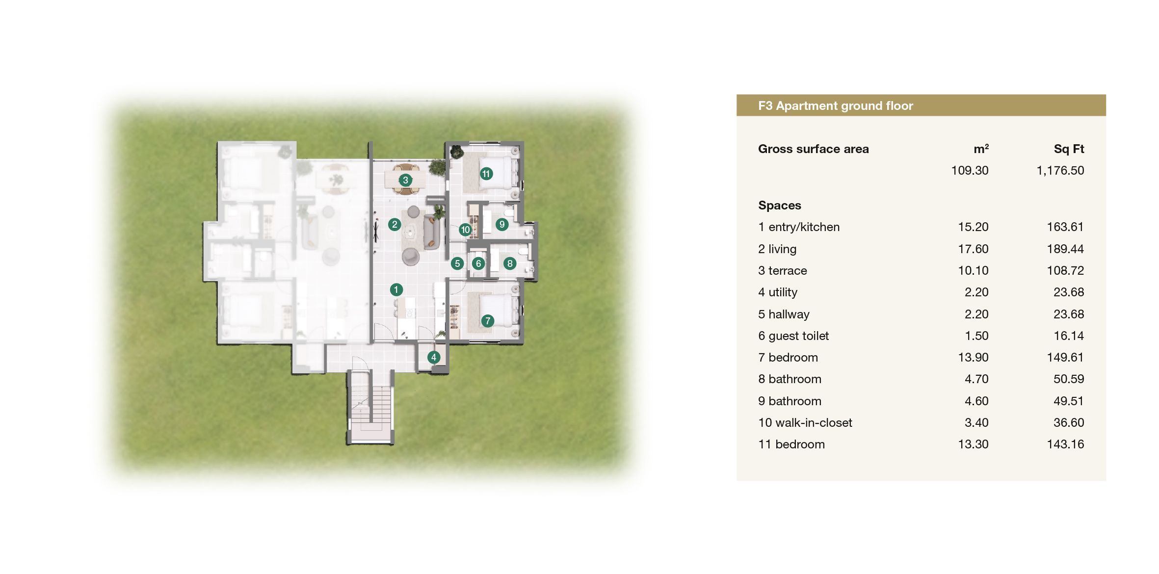 These 109 m² gross apartments feature an open, light layout with sleek design. The central kitchen island flows seamlessly into a spacious balcony, blending indoor and outdoor living.