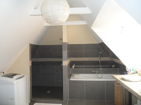 • Luxe badkamer met ligbad, aparte douche, dubbele wastafel, toilet en wasmachine
