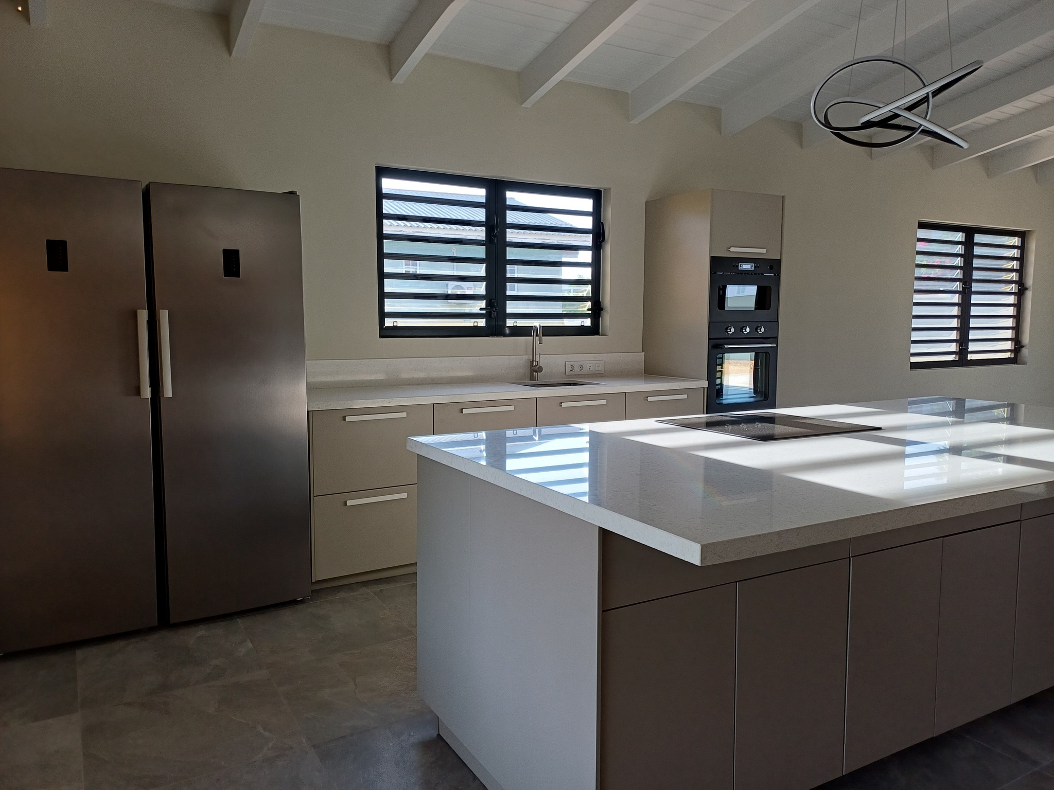Luxe keuken met kookeiland, elektrische kookplaat, vaatwasser en hoogwaardige inbouwapparatuur